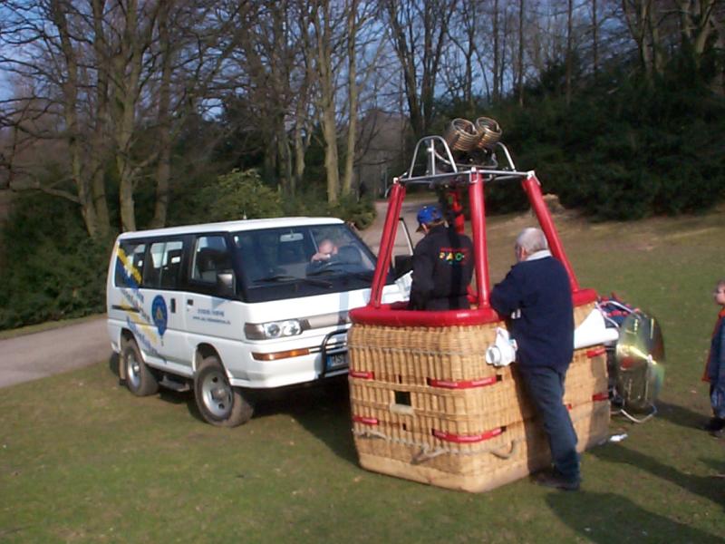Im Bochumer Stadtpark ist also der Startplatz. Der Korb ist schonmal aufgestellt und wird am Bus befestigt. Rechts ist der Propeller zu sehen, mit dem später die Ballonhülle mit Luft gefüllt wird.