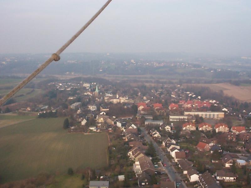 Am unteren Bildrand erkennt man die Wiese, auf der unser 2. Landeversuch misslungen ist. Als wir schon fast aufgesetzt hatten, wurde der Ballon nochmals von einer Windboe erfasst und in die Hecke gedrückt. Auch hier musste der Pilot durchstarten. |
